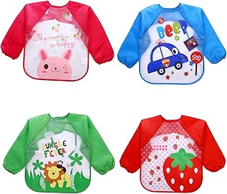 WELLXUNK® Bavoir Etanche à Manchs Longue, 4Pcs Bavoirs Bébé Manches Longues, Bavoir Bébé D'alimentation, Enfant Bavoir Cartoon Bavoir, Unisexe ImperméAble Manches Longues Bavoir pour Enfants