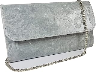 Pochette en cuir véritable pour femme - Motif métallique - 25 x 15 cm - Gris - Fleurs gris clair.,