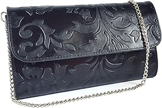 Pochette en cuir véritable pour femme - Motif métallique - 25 x 15 cm - Noir - Fleurs noires.,